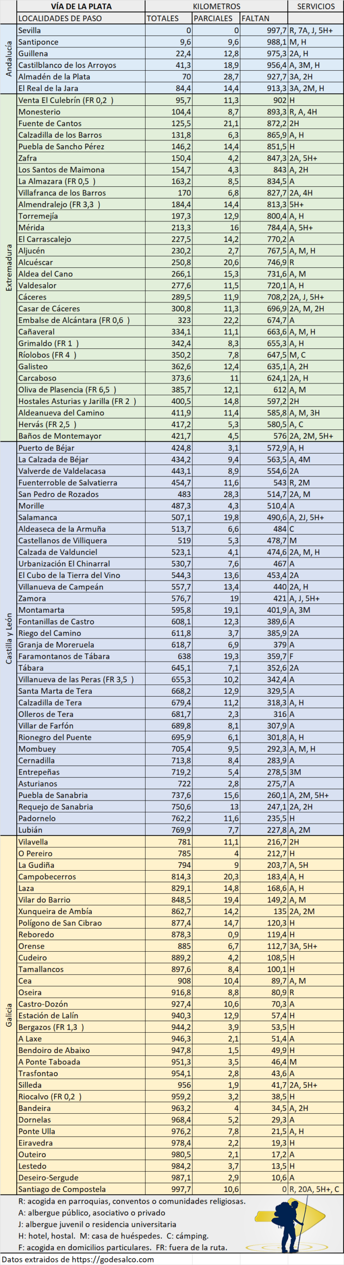 El punto de partida más habitual es Sevilla, desde donde el peregrino sigue las antiguas calzadas romanas atravesando localidades como Castilblanco de los Arroyos, Almadén de la Plata, Zafra, Mérida o Cáceres.